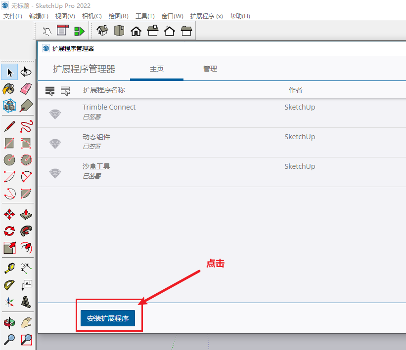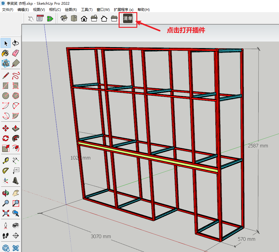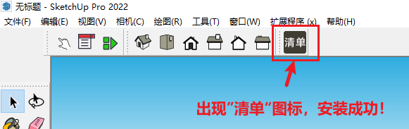 找到顶栏 扩展程序》扩展程序管理器》安装扩展程序》选择桌面找到 “清单导出.rbz”。这是会出现”清单“图标显示安装成功!