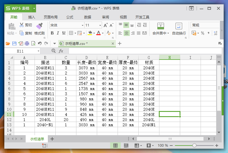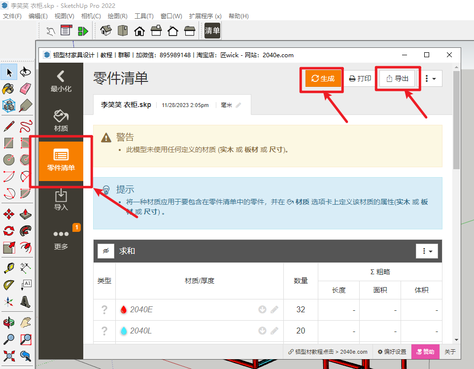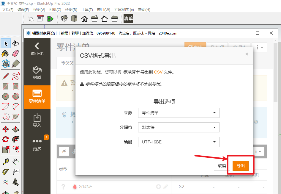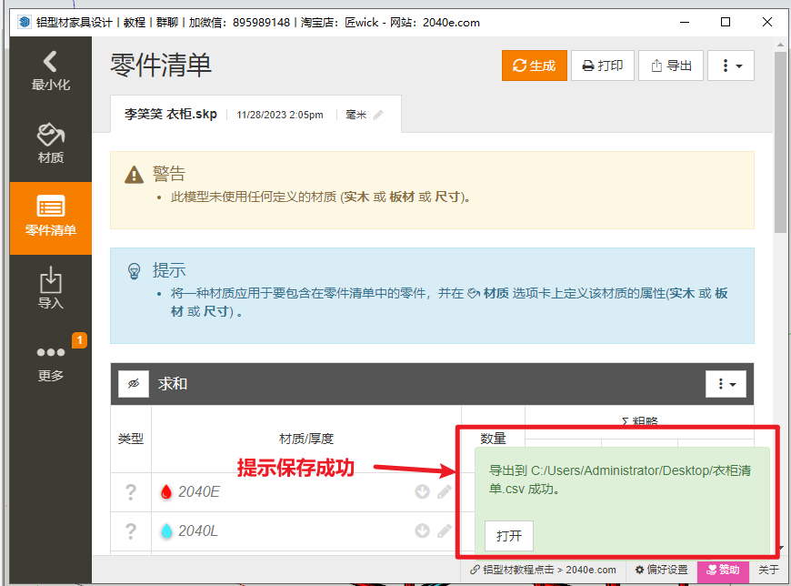 打开已经设计好的型材图纸,点击“清单导出”插件》选择零件清单》点击生成》导出》选择保存位置(比如“桌面”)》输入”衣柜清单.csv“》保存。